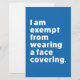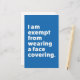 Viele Menschen tragen Gesichtsmasken und andere Verkleidungen, um sich vor COVID-19 und ähnlichen Infektionen zu schützen; in einigen Teilen der Welt besteht die gesetzliche Verpflichtung, sie in bestimmten Bereichen zu tragen. Allerdings kann nicht jeder eine Maske tragen. Manche Menschen sind aus gesundheitlichen oder anderen Gründen von der Steuer befreit. Kindern werden oft Ausnahmen gewährt. Auch Personen mit Asthma, Atembeschwerden, Angst und vielen anderen Erkrankungen werden empfohlen, keine Gesichtsmasken zu tragen. Dieses Design soll das allen um Sie herum klar machen. Der Text Staaten eindeutig: "Ich bin vom Tragen eines Gesichtsbelags befreit".