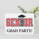 Das Einladungs-Design bietet ein gewagtes, gefeiertes Thema mit "SENIOR", das in großen roten Buchstaben, in schwarz dargestellt, hervorgehoben dargestellt wird. Das Jahr "2025" ersetzt das "I" in "SENIOR" und wird vertikal in schwarz geschrieben, überragt mit einem schwarzen Graduierungsdeckel. Unten wird "GRAD PARTY!" in großen, fett gedruckten, schwarzen Buchstaben geschrieben, die die Spannung des Abschlusses für die Klasse von 2025 aufzeichnen.