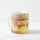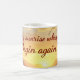 A warm and uplifting sunrise scene featuring a golden field of wildflowers glowing under the morning light. The quote “Every sunrise whispers ‘Begin again’” appears in elegant red script above the horizon, with soft mountains and flying birds in the distance. This design radiates positivity, renewal, and hope