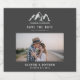 Modernes Hochzeitsdesign mit trendigen Schriftart und Bergbildern, das Abenteuer beginnt!