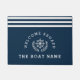 Bootsmatte mit blauen Streifen und personalisierten Namensangaben und nautischen Elementen Die Farbe und der Text sind editierbar.