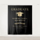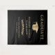 Elegante schwarze Graduiertenparty mit Begrüßungs-Tapisserie und Foto-Kulisse mit goldener Graduiertenkappe, "Graduate" und dem Namen, der Schule und dem Klassenzimmer des Absolventen in klassischer Goldtypografie.