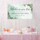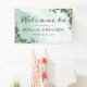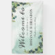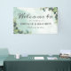 Rustikales Begrüßungsbanner mit einem staubigen, grün/blau verblassten Aquarellhintergrund, botanischen Eukalyptus-Blätter, Splash von Imitaten Goldfolie und einer Textvorlage, die leicht zu personalisieren ist.