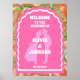 Unser minimales, mutiges Retro-Begrüßungszeichen ist perfekt für das trendige Ehepaar, das von Lieben stehend und kühn zum Ausdruck gebracht wird. Unser Design zeichnet sich durch eine fett leuchtend rosa-orange Farbkombination aus. Einfach abstrakter Blumenbogen und Kreisformen schaffen einen kühnen Look mit "Willkommensgruß", mutig in weißem, großen Schriftart dargestellt.