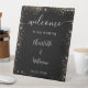 Ein Begrüßungszeichen für eine Hochzeit. Ein stilvoller schwarzer Hintergrund mit Imitaten goldenen Glitzer Glitzern. Personalisieren und fügen Sie Ihre Namen und das Hochzeitstermin. Weiße Buchstaben.