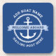 Untersetzer mit weißem nautischen Anker, umgeben von einem Seilstreifen auf dunkelblauem Hintergrund. Über dem Anker befindet sich ein hellblaues Banner mit anpassbarem Text "welcome on board". Fügen Sie den Namen Ihres Bootes und den Hafen hinzu.