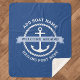 Sherpa-Decke mit weißem nautischen Anker, umgeben von einem Seilstreifen auf dunkelblauem Hintergrund. Über dem Anker befindet sich ein hellblaues Banner mit anpassbarem Text "welcome on board". Fügen Sie den Namen Ihres Bootes und den Hafen hinzu.