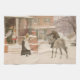 Die Begrüßung des Postmanns durch Robert Walker Macbeth (1848-1910) ist ein Vintages Viktorianisches Portraitbild. Eine Frau sucht nach der Post, die vom Postboten auf einem Pferd zugestellt wird. Der Briefträger übergibt der Dame des Hauses Weihnachtsbriefe während eines Schneesturms im Winter.