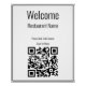 Brauchen Sie ein einfaches und dennoch elegantes Plakat, um Gäste in Ihrem Restaurant willkommen zu heißen? Dieses schwarz-weiße Businesspopster verfügt über vier Darstellungstexte, die Sie bearbeiten können, um eine personalisierte Nachricht zu zeigen. In der obersten Zeile steht Willkommen. Die nächste Zeile ist für Ihren Firmennamen. Die dritte und letzte Zeile sind für benutzerdefinierten Text. Momentan heißt es in diesen Zeilen Bitte warten, um gesetzt zu werden und nach Menü suchen. Ein QR-Code ist unten. (Denken Sie daran, Ihre URL einzugeben, damit der QR-Code korrekt funktioniert.)