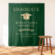Elegante grüne Graduiertenparty mit Begrüßungstapeten und Foto-Stand-Kulisse mit goldener Graduiertenkappe, "Graduate" und dem Namen, der Schule und dem Klassenzimmer des Absolventen in klassischer Goldtypografie.