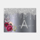 Ein Imitat Silver Blick Hintergrund mit Imitaten Silber Glitzer Tropfen, Farbe Tropfausdruck aussehen. Die Blume sind mit bordeauxfarbenen Blumen geschmückt. Personalisieren und fügen Sie Ihren Familiennamen und Monogramm Buchstaben, initial. Weiße und graue Buchstaben. Der Name wird mit einem angesagten, handgeschriebenen Skript mit Swashes geschrieben. Um die Swashes behalten, löschen Sie nur den Beispielnamen, verlass die Leerzeichen oder Emoji's vor und nach dem Namen.