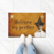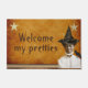 Halloween-Dekor mit Vintager schwarzer Hexe mit extravagantem Hut-Foto, das auf einem angeschlagenen Hintergrund mit Sternen ausgeschnitten wurde, und anpassbarem Text "Welcome my pretties"