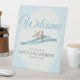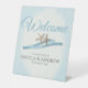 Blaue Seesterne und buntes Begrüßungszeichen mit bearbeitbarem Text, um unser Set für die Hochzeit am Strand zu ergänzen.