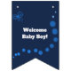 Begrüßung Baby Boy bunte Fahnen mit Punkten und Konfetti auf blauem Hintergrund
