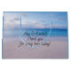 Große Papier Hochzeitstasche mit einer Strandszene. Passen Sie den schwarzen, gedruckten Text auf der Vorderseite an, um den Gästen für die Teilnahme an einer Hochzeit am Meer zu danken. Blaues Meerwasser und glatter Strand-Sand sind die Bilder auf beiden Seiten. Made for a wedding, aber dieses Design funktioniert auch für Geburtstage und andere Veranstaltungen. Text kann entfernt werden.