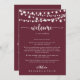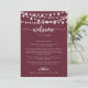 Diese Saite leuchtet bordeauxfarbenen Begrüßungsbrief ist perfekt für eine rustikale Hochzeit. Das Design besticht durch schöne handbemalte Saitenleuchten in bordeauxrotem Hintergrund. Personalisieren Sie die Front mit einer Begrüßungsbotschaft für Ihre Gäste und Ihren Namen. Personalisieren Sie den Rücken mit dem Veranstaltungskalender und anderen nützlichen Informationen.