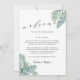 Teilen Sie uns eine Willkommensbotschaft für Ihre Hochzeitsgäste an tropischen oder Strandorten sowie einen Ausflug oder Zeitplan für die Veranstaltungen am Wochenende. An der Vorderseite wird Ihre Begrüßungsbotschaft mit zarten grünen Palmenfronten an den Ecken hervorgehoben. Auf der Rückseite des Hotels können Sie Ihren Hochzeitstag oder Ihr Hochzeitswochenende individuell gestalten. Ideal, um in Begrüßungssäcke des Hotels zu übernachten oder um die Zimmer Ihrer Gäste zu versenden.
