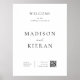 Dieses elegante Hochzeitsempfangsschild zeichnet sich durch ein minimalistisches Design mit klaren Linien und eine moderne Ästhetik aus. Der Text ist zentriert und gerahmt mit einer dünnen schwarzen Grenze, die ein poliertes und raffiniertes Aussehen verleiht. Das Poster begrüßt die Gäste herzlich zur Hochzeitsfeier und hebt die Namen der Ehepaare in fett anmutenden, stilvollen Schriftart hervor, was einen eindrucksvollen Fokus schafft. Das Schild unten beinhaltet das Hochzeitdatum und die Lage in einem kleinen, raffinierten Schriftart. Zusätzlich befindet sich unten rechts ein QR-Code, der die Gäste zum digitalen Scannen und Betrachten des Hochzeitsprogramms einlädt und dem klassischen Design eine zeitgemäße Touch verleiht. Die Einrichtung ist schlicht, einfach und effektiv, perfekt für eine moderne Hochzeit.