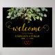 Dieses Begrüßungsschild mit schwarzem und goldenem Brautmotiv ist mit grünen Eukalyptusbäumen, grünen und goldenen Blätter versehen. Für eine erweiterte Anpassung dieses Designs klicken Sie bitte auf den personalisierten Link