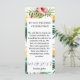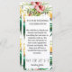 Diese Begrüßungskarte für Besucher verdoppelt sich als Hochzeitsprogramm. Beide Seiten der Karte haben ein grünes Blumenmuster. Auf der Vorderseite der Karte befindet sich der Begrüßungsgruß des Paares für die Gäste, auf der Rückseite befindet sich eine einfache Bildzeitleiste der Hochzeit.