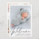 Eine schlichte und elegante Geburtsankündigung mit dem Foto Ihres Neugeborenen, das in einem stilvollen Schriftsatz mit "Welcome" überlagert wird. Geben Sie den Namen, das Geburtsdatum und die Geburtsdaten Ihres Babys ein. Fügen Sie auf der Rückseite weitere 3 Fotos und eine personalisierte Nachricht hinzu.
