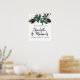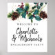 Holly- und Kiefernbäume sind mit roten Beeren, Nadelkronen und goldfarbenem Glitzer verziert und dekoriert, um einen Urlaubssrig zu schaffen, der ganz oben auf dem Design steht. Die Namen der Ehepaare werden in einem fett geschriebenen Schriftart geschrieben. Willkommen und Engagement Party sind in einem klassischen Serif-Schriftart geschrieben. Elegant und leicht zu bearbeiten.