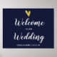 Elegantes goldfarbenes Imitat-Herz Begrüßungsschild mit schicken weißen Schriften auf marineblau Hintergrund.