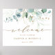 Dieses Begrüßungsschild zeigt malte Aquarellmalerei Eukalyptus, botanisches Grün und goldene Glitzer-Blätter mit Goldschrift.