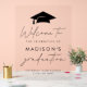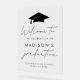Modernes Partyzeichen mit schwarzer Graduierungshülse oben mit handgeschriebenen Akzenten auf transparentem Acrylgrund. Personalisieren Sie das einfache Abschluss-Zeichen mit dem Namen des Absolventen, dem Schulnamen und dem Abschluss Jahr unten. Das trendige Acryl-Abschluss-Schild eignet sich sowohl für Absolventen der Highschool als auch für Unis!