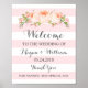 Herzlich willkommen auf dem Poster "Wedding" mit individuelle Name und Datum in hellrot-weiß gestreiftem Muster mit Vintag pfirsichrosa Aquarellfarben-Blume mit handgeschriebenen Stilschriften.