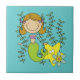Eine braune behaarte lächelnde Meerjungfrau und ein gelber Starfish schwimmen unter der Meerespflanze, ein Entwurf, der niedlich und für Mädchen bunt ist, die Liebe der Ozean und die Meerjungfrauen! Meerjungfrau-T - Shirts, Bodysuits, Schellfische, Decken, Burpstoffe, Karten, Aufkleber, Taschen, Tassen-, Schlüsselketten, Kissen, Wanduhren und Lose anderer Meerjungfrau übersetzen!