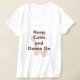 Großartiger T - Shirt der Tänzerin, mit einer rosa Silhouette von Ballettschuhen. Dunkelgrauer, fett gedruckter Text, über die Schuhe, liest Behalt Calm und Dance On. Personalisieren Sie, um den Text zu ändern, um ihn anders zu lesen. Ideal für jeden Ballett-Tänzer, wählen Sie einfach die Größe und den Stil, auf die Sie dieses Design gewollt haben.