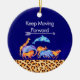Ein Ornament mit einem motivierend Zitat, das lautet: Behalt vorwärts zu gehen. Entworfen mit einem digitalen Aquarellbild einer Herde wilder Tiere, die zusammen laufen. Zu den Tieren zählen ein springender Delphin, eine Giraffe, Elefant, Känguru, Nashorn, Löwe und Leopard. Ein weißer Pfeil unter dem Text.