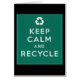 Behalten Sie Ruhe und Recycle ist eine Parodie des Kriegspostens behalten Ruhe und weitermachen. Grüner Hintergrund mit verwittertem Blick. Recyceln Sie Symbol und weißen Text. Wunderbare Klimageschenke für Recycler und Tag der Erde!
