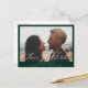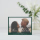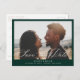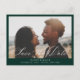 Beige Kalligraphie-Overlay, Foto Hochzeit speichern Sie das Datum Postkarte. Grüner Hintergrund vorne, weißer Hintergrund hinten mit dunkelbeige Typografie koordiniert. Die Karte zeigt eine elegante beige Kalligraphie "Save the Date" Grafik auf Vorder- und Rückseite. Elegantes und trendiges monochromes Design.