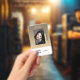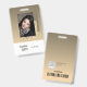 Name Abzeichen mit graufarbenem Hintergrund, Foto, Strichcode und Logo-Vorlage. Passen Sie dieses Abzeichen einfach an Ihre Marke an.