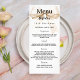 Geburtstagsmenü Karte. Personalisieren und fügen Sie einen Namen, Alter, Datum und das Menü. Weiß und ein großer beige, cremefarbener Bogen.