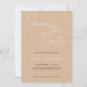 Einfache Hochzeit im Stile rette den aktuellen Einladungen, die mit einem schwarzen, stilisierten Skript auf einem trendigen, beigen Hintergrund versehen sind. Bearbeiten und ersetzen Sie Namen, Datum und Position mit Ihrem eigenen. Wählen Sie Ihre Einladungsgröße und Ihren Papierstil aus.