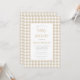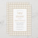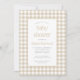 Diese Babydusche lädt mit einem rustikalen beige-weißen Gingham-Hintergrund ein. Der Text erscheint in einem weißen Rechteck mit einem dünnen beigen Rand und abgerundeten Ecken, mit den Worten "Babydusche" und dem Namen der künftigen Mama in zauberhafter beige Typografie und dem übrigen Text in grauem Sans Serif Schriftart. Ideal für eine Baby- oder Jungendusche. Das Gingham-Muster wird auf der Rückseite der Karte wiederholt.