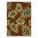 Notizkarte in einem zeichn von Pfauenfedern, verstärkt und in einem weichen Konte-Effekt gerendert - weiche goldene Beige und Bräune, mit Rost, Kobaltblau und smaragdgrünem Auge, auf einem schokoladenbraunen