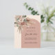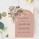 Eine moderne, stilvolle und romantische Save the Date-Karte für eine Hochzeit. Creme, pfirsichfarbener Hintergrund, ein antiker, farbiger Bogen aus der Rose, wunderschön dekoriert mit gedämpften, erdigen Rose, Eukalyptus-Pflanzen und Pampas-Gras für ein natürliches und romantisches Ambiente. Personalisieren und fügen Sie das Datum, Ihre Namen. 1 Blatt = 1 Save the Date bedruckte Kante bis Kante.
