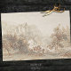 Antikes zeichnend in Sepia-Tönen mit einem Jagd-Party mit Pferden und Hunden am frühen Morgen und einem Schloss im Hintergrund perfekt für Entdeckungsprojekte