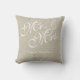 Personalisiert Beige und Weiß Mr. und Mrs. Wedding Pillow mit drei Buchstaben Monogramm auf der Rückseite. Design von Elke Clarke©. Abrufbar unter www.zazzle.com/monogramgallery. Kleiner, personalisierter, beigefarbener Leinen-Hintergrund (gedruckter Foto-Effekt), mit Braut- und Bräutigamen in weißem Skript-Schriftart und Hochzeitstag anpassbar. Schönes Design ist ideal für Hochzeitsgeschenke, Liebeskissen, Hochzeitsgeschenke und vieles mehr. Benutzen Sie das Editing Menü, um die Farben zu ändern oder besuchen Sie unseren Shop für weitere Designs und Farboptionen.