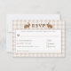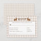 RSVP card featuring Destei's beige gingham background and two watercolor hare bunnies framing the “RSVP” title at the top. The center area is white with a brown border, providing personalizable text fields for guests to indicate their meal selection from three entrée choices, accept or decline the invitation, the number of attendees and any dietary requirements.