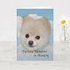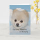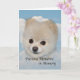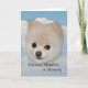 Ein reizender und weicher Spitzhund mit großen dunklen Augen wird in einen Hintergrund des Himmels und der Wolken auf dieser Beileidskarte für jemand gemischt, das einen Haustierhund verloren hat. Ein Angebot des Beileids diesmal lässt Ihren Freund wissen, dass Sie an sie als erhalten durch dieses Herz denken, das Zeit bricht. Der Innere-Vers ist eine Textschablone und leicht geändert oder gelöscht.