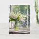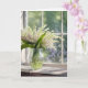 Lily of the Valley Blume Bouquet in einer Glasvase durch ein sonnenbeleuchtetes Fenster und lila Busch für das allgemeine Beileid. Text ist bearbeitbar.