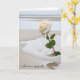 Eine einsame, weiße aufrechte Rose auf einem weißen Sandstrand mit einem lauen Meereswasser. Der Text ist essbar.