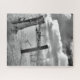 Viel Spaß beim Zusammenstellen von "Posts in the Snow" Puzzle. Ein Bild von zwei Holzpfosten im Schnee mit dicken flauschigen Wolken an einem sonnigen Tag im Hintergrund. Fertig in schwarz-weiß.