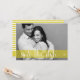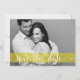 Whimsical Save the Date Script Foto Announcement Anpassbare Save the Date Karte mit einem durchsichtigen gelben Banner und whimsical Kalligraphie Skript.