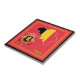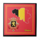 Die Nationalflagge Belgiens ist in eine Landkarte der Kontur des Landes eingegliedert. Das Wappen des Landes ist ebenfalls enthalten und beide sind auf einem roten Hintergrund mit gelben Rahmen, um das Design zu vervollständigen.
